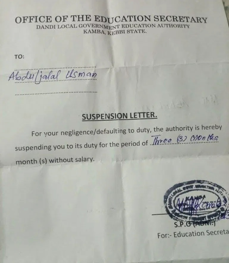 The teacher, AbdulJalal Usman, received a three-month suspension without pay through a letter issued by the office of the Education Secretary in Dandi Local Government Area. In the letter, the authorities accused him of “negligence and defaulting to duty,” which led to the disciplinary action.